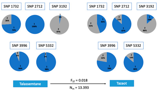 However, the AMOVA (Table S2) indicated low differences among populations, with 2% of the total, while the highest differences were observed within individuals, 57%. These results are based on the FST value (0.018), which showed that there are no differences between populations with a high significance (p = 0.0001). The number of private alleles was higher in Tazaot than in Talassemtane. Shannon index values were low but slightly higher in Tazaot. For Talassemtane and Tazaot, the grand mean values of the number of effective alleles are 1.524 and 1.528, respectively. Nei’s genetic distance (0.021) indicates that both populations are very close. Finally, the Nm value (13.393) shows the presence of a high gene flow among populations, which reduces population differentiation. Therefore, both populations are in complete panmixia.