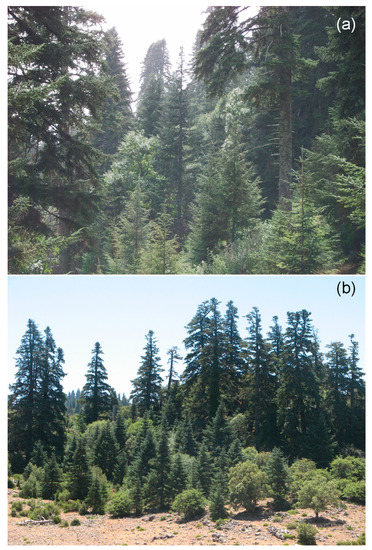 Field sampling was carried out at Talassemtane (TA, 35.14 N, −5.14 W, 1653 m a.s.l.) and Tazaot (TZ, 35.26 N, −5.10 W, 1722 m a.s.l.) ranges, which are home to natural unevenly aged Abies marocana stands that have not been intensively managed since the middle 20th century [12] (Figure 6).