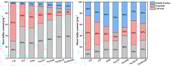 It can be seen from Table 2 that the three sulfur forms significantly changed the S content in the subcellular components of A. alpina, but different forms of sulfur had different distributions of sulfur content in the root and shoot cell walls, organelles, and soluble components of A. alpina. Compared with the CK, 75 mg·kg−1 and 150 mg·kg−1 elemental S treatments significantly reduced the sulfur content in the root and shoot organelles of A. alpina by 58% and 49%. Na2S treatment significantly increased the sulfur content of the root cell wall and the soluble component of A. alpina by 116% and 183% and significantly reduced the organelle sulfur content by 68% (Figure 1). Further, the shoot cell wall and soluble component sulfur content increased by 82% and 90%, respectively, and the sulfur content of organelles was significantly reduced by 84%. Na2SO4 treatment significantly increased the sulfur content of the root and shoot cell walls and soluble components of A. alpine by 3.65, 5.75, 4.58, and 3.35 times, respectively, and significantly reduced the organelle sulfur content to 83% and 89%.