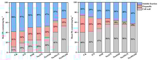 From Table 3, compared with the CK, it can be seen that different forms of sulfur treatment significantly changed the lead content in the root and shoot subcells of A. alpina; in addition, the SO42− treatment, as well as S and Na2S treatments increased Pb in the lower ground cell wall by 58% to 101% compared to CK, but there was no significant difference between the two treatments and the different concentrations. Under 150 mg·kg−1 Na2SO4 treatment, the lead content in the root and shoot cell walls of A. alpina significantly increased by 255% and 175%, respectively. Under S, Na2S, and Na2SO4 treatments, the lead content in the root and shoot organelles of A. alpina significantly reduced by 30%, 45%, and 63%, and by 22%, 59%, and 74%, respectively (Figure 2). In addition, the soluble components in the root significantly reduced by 24%, 42%, and 59% in sequence, and the soluble components in the shoot significantly increased by 74%, 138%, and 246% in sequence.