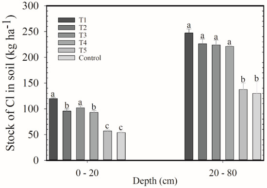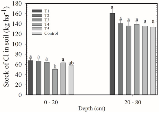 In this harvest, treatments showed Cl stocks near 65 kg ha−1 in the 0–20 cm layer (Figure 1). The lowest Cl amount was stocked with T4 (50 kg ha−1). In the 20–80 cm layer, the average stock of the six treatments was 122 kg ha−1.