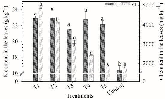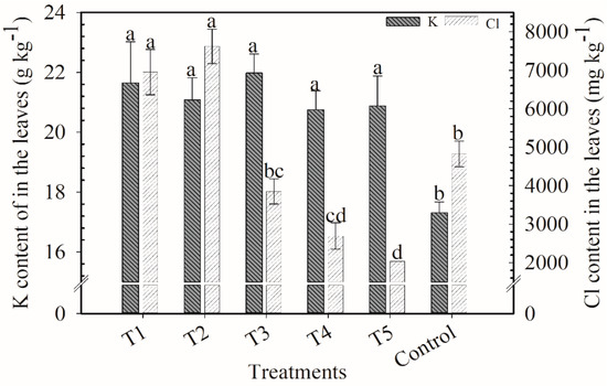 K content in the leaves varied from 17 to 21 g kg−1, and the lowest value was in the control (Figure 2). Overall, Cl content in the leaves decreased with less KCl applied. Treatments T1 (6950 mg kg−1) and T2 (7621 mg kg−1) were far superior from the others.