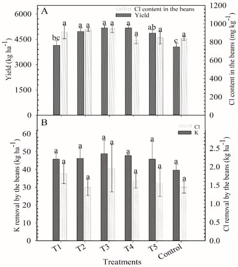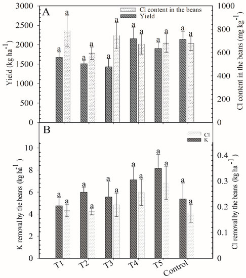 There was no significant differences among treatments for the following variables: Cl content in beans (693 mg kg−1; Figure 3A), yield (1804 kg ha−1; Figure 3A), and K removal (6.0 kg ha−1) and Cl removal (0.21 kg ha−1; Figure 3B).