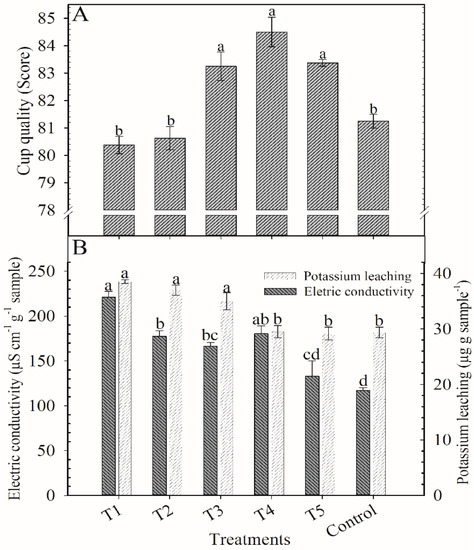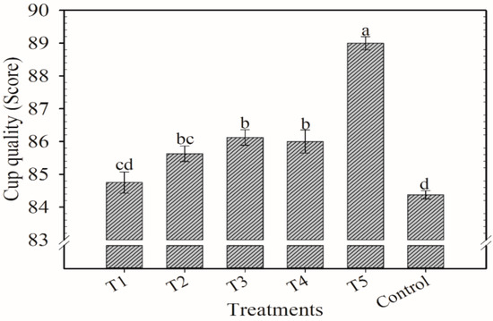 All treatments received over 80 points in the cup quality (Figure 7A). The highest scores were achieved by treatments T3 (83 points), T4 (84.5), and T5 (83).