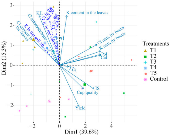 Principal component analysis for the harvest of 2018/2019. PPO = activity of the enzyme polyphenol oxidase; KL = K leaching; TTA = total titratable acidity; EC = electric conductivity; Pol = total phenolic compounds; Caf = content of caffeine; TS = content of total sugars; K in the soil 20 = stock of K in the 0–20 cm layer; K in the soil 80 = stock of K in the 20–80 cm layer; Cl in the soil 20 = stock of Cl in the 0–20 cm layer; Cl in the soil 80 = stock of Cl in the 20–80 cm layer, K rem. by beans: K removal by the beans, Cl rem. by beans: Cl removal by the beans. T1: 100% KCl, T2: 75% KCl + 25% K2SO4, T3: 50% KCl + 50% K2SO4, T4: 25% KCl + 75% K2SO4, T5: 100% K2SO4.