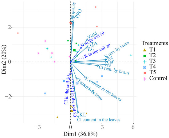 Therefore, the treatments in the following PCAs represent the proportions of KCl and K2SO4 as described before. Thus, the closer they are, the greater the correlation between the variables that constitute these treatment groups. The agronomic variables stocks of K and Cl in the 0–20 and 20–80 cm layers, K and Cl contents in the leaves, yield, K and Cl removal in the beans and Cl content in the beans are supplementary variables; that is, they do not contribute to explaining the variability of the data. These illustrative variables are represented as dashed arrows, and they help to interpret the other data.