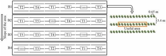 Schematic representation of the experimental design, number of plants in each plot, and the useful area used to collect the data.