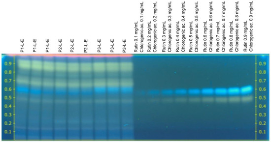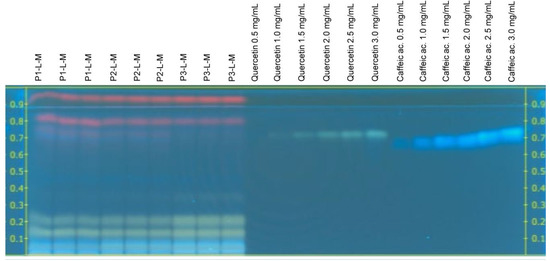According to Figure 1 and Figure 2, rutin (yellow) and chlorogenic acid (blue) bands were observed in all the extracts from C. sulphureus analyzed in this study (Rf 0.48 ± 0.04 and 0.60 ± 0.04, respectively), while in the case of caffeic acid (blue) and quercetin (green) bands, they were only observed in the C. sulphureus leaf extracts (Rf 0.71 ± 0.03 and 0.78 ± 0.04, respectively). The pink and purple-colored bands were not identified as phenolic compounds according to the standards used for the analysis.