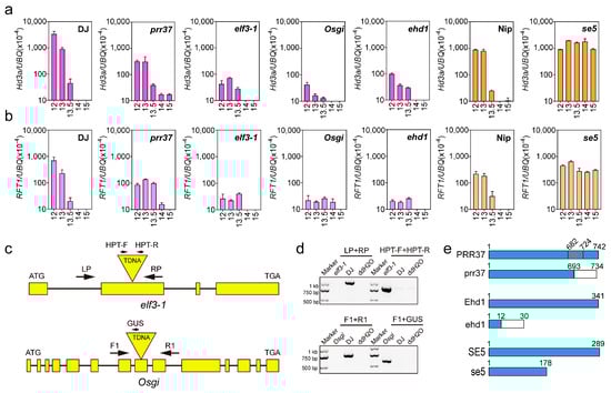 The rice (Oryza sativa) subspecies japonica DJ and Nip were used as the wild type. The T-DNA insertion mutants elf3-1 and Osgi were previously reported [30,78]. The se5 mutant with a nucleotide mutation caused an early termination. All of the recombinant vectors and mutants were confirmed by PCR or sequencing. The DNA sequencing results are shown in Supplementary Figure S1. The primers are listed in Table S1.