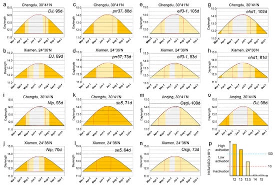 As a typical short-day (SD) plant, rice exhibits critical daylength sensing with a threshold of 13.5 h [15]; rice flowers earlier under SD than under long-day (LD) conditions [16]. However, daylength in summer is always longer than 13.5 h in most rice-growing regions, particularly at high latitudes [16,17].
