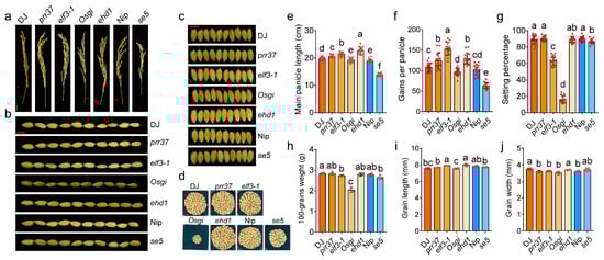 Phenotypic characterization of main panicles and grains of the wild-type and mutant. (a–d) The phenotypes of main panicle (a), grain length (b), grain width (c), and yield per panicle (d) of DJ, prr37, elf3-1, Osgi, ehd1, Nip, and se5 at the mature stage. The red lines are scale bars. (e–j) Main panicle length (e), grains per panicle (f), setting percentage (g), hundred-grain weight (h), grain length (i), and grain width (j) of DJ, prr37, elf3-1, Osgi, ehd1, Nip, and se5. Data are presented as means ± SD, n = 15 (e–g), or four biological replicates (h–j). Scale bars: 2 cm for main panicle; 5 mm for grain length; 5 mm for grain width; 1 cm for yield per panicle. The letters above each column indicate significant differences by Duncan’s multiple range test (p < 0.05). All agronomic traits of the wild-type and mutant were collected under natural conditions in Xiamen.