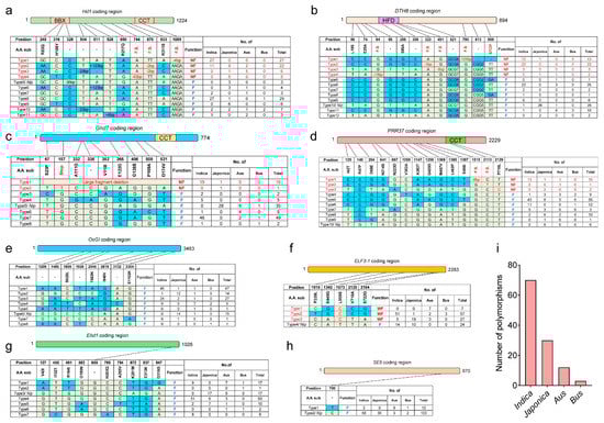 The Hd1-DTH8-Ghd7-PRR37 module regulates rice daylength-sensing in rice, and natural variation in the underlying photoperiod genes changes the daylength-sensing processes, which play a vital part in the adaptation of rice cultivars to multi-latitude regions [16,24]. To expand this analysis to photoperiod genes, we collected the DNA sequences for Hd1, DTH8, Ghd7, PRR37, SE5, OsGI, Ehd1, and ELF3-1 from 115 rice germplasm resources (70 indica, 30 japonica, 12 Aus, and 3 Bus) [42,43,44,45,46,47,48,49,50,51], and looked for polymorphisms (Figure 4). Among the 115 rice materials, we identified 11 haplotypes for Hd1, of which seven (in 55 rice varieties) were functional, while the remaining four haplotypes (present in 60 rice varieties) were predicted to encode a non-functional protein due to the presence of frameshifts (Figure 4a). Likewise, we detected 12 haplotypes for DTH8, with 40 rice varieties harboring non-functional alleles, including 37 indica (Figure 4b). This result was consistent with our previous study, in which we determined that Hd1hd1 dth8dth8 is one of the major genotypes of indica hybrid rice in East Asia [16]. We also observed two non-functional haplotypes at Ghd7, one with a large fragment deletion and the other with early translation termination, accounting for 14.8% (or 17) of all accessions among the 115 germplasms (Figure 4c). We identified three non-functional variants in PRR37, two with frameshift mutations and the one with three amino acid substitutions (Figure 4d). Three of them (N214S, L462P, and P710L) were located at the conserved positions among their homologs, and a previous study suggested that these substitutions may affect the PRR37 function [34].