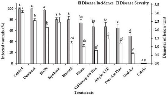 Disease incidence (infected wounds, %) and disease severity (lesion diameter, cm) on citrus fruits cv. “Tarocco Scirè” wounded, treated with alternative products, Ossiclor and Cabrio (1%) and artificially inoculated with C. gloeosporioides. Water-treated fruits were used as a control. Data were recorded after six days of incubation at 25 ± 1 °C and 95–98% RH. Bars represent the standard error of the mean (SEM). For each parameter, columns with different letters are statistically different according to Fisher’s least significance difference test (LSD) at p-value < 0.05. Data are the means of two trials.