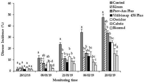 Time progression of natural anthracnose symptoms on citrus fruits cv. “Tarocco Sciré” treated in the field with alternative products, Ossiclor or Cabrio. Field treatments were carried out three times (28 December 2018; 15 January 2019; 6 February 2019). Disease incidence was expressed as percentage of symptomatic fruits/treatment. Bars represent the standard error of the mean (SEM). Columns with different letters are statistically different according to Fisher’s least significance difference test (LSD) at p-value < 0.05.