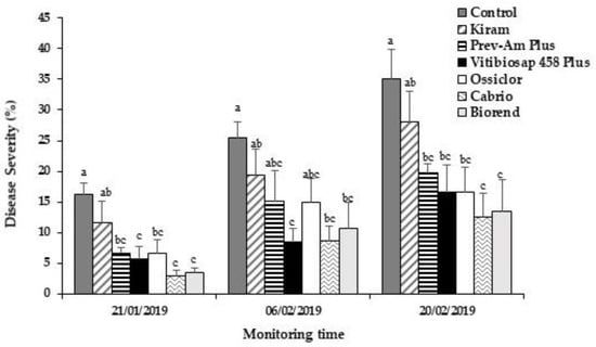 Time progression of disease severity on citrus fruit cv. “Tarocco Sciré” treated in the field with different alternative products, Ossiclor or Cabrio. Disease severity (DS%) was expressed as rating scale (see Section 4.5). Bars represent the standard error of the mean (SEM). Columns with different letters are statistically different according to Fisher’s least significance difference test (LSD) at p-value < 0.05.
