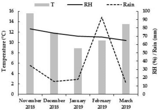 Climate data from March 2018 to March 2019, by the weather station of Francofonte (CT), Sicily. T = Temperature; RH = Relative humidity.