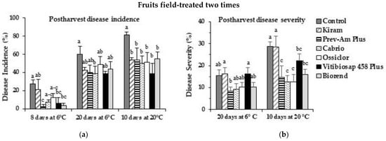 In fruits field-treated two times, DI (Figure 5a) was significantly (p < 0.05) reduced (DI reduction 32.3% to 52.3%) (data at the end of storage periods), with values similar to those recorded for Ossiclor and Cabrio. Similarly, DS (Figure 5b) was reduced by all products, except Kiram (DS reduction 22.6% to 48.7%).