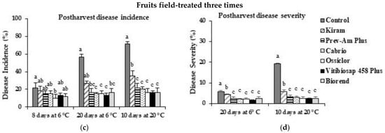 Likewise, DI (Figure 5c) was significantly reduced in fruits field-treated three times (DI reduction 51.1% to 76.7%) and all products, except Kiram, showed an efficacy significantly (p < 0.05) similar to Ossiclor and Cabrio. Similarly, DS was reduced by all products (DS reduction 83.3% to 87.2%) (Figure 5d), with effects comparable to those observed with Ossiclor and Cabrio. On the whole, the third field treatment significantly improved the overall results compared with only two treatments (Figure 5). Most important, pre-harvest treatments significantly protected the fruits from anthracnose with all tested compounds except Kiram.