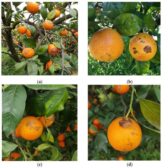 Anthracnose disease symptoms on naturally infected “Tarocco Sciré” fruits: severe anthracnose fruit spot (a); small to large lesions (b,c); necrotic lesions at the stem-end of fruit (d).