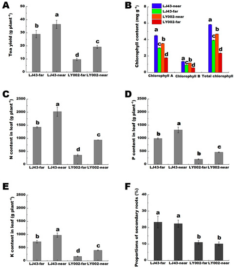 The phenotypic features of growth for the two tea plants are shown in Supplementary Figure S1B. For LJ43 tea plants, the far (LJ43-far) and near (LJ43-near) fertilization belt had similar phenotypic features of growth, including leaf color and germination density, whereas the LY002, the LY002-far had shallower leaf color and lower germination density compared with that of the LY002-near. In terms of the yield of dry tea, LJ43-far was 80% of LJ43-near, whereas LY002-far was merely 50% of LY002-near (Figure 1A). In terms of chlorophyll A, chlorophyll B, and total chlorophyll content, LJ43-far was above 65% of LJ43-near, whereas LY002-far was merely 50% of LY002-near (Figure 1B). In terms of the contents of N, P, and K in leaves, LJ43-far was above 70% of LJ43-near, whereas LY002-far was merely 50% of LY002-near (Figure 1C–E). The proportion of secondary roots was significantly higher for LJ43 than for LY002 (p < 0.05) (Figure 1F).