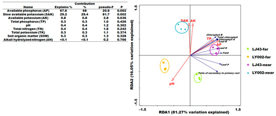 The results of RDA analysis between the soil nutrient features and tea plants (LJ43 and LY002) are presented in Figure 2. Regarding the four data groups, LJ43-far, LY002-far, LJ43-near, and LY002-near were relatively separated between different groups but clustered within their respective groups. These results indicate that there was good data repeatability and obvious differences between the data in the four groups. There was a small difference between LJ43-far and LJ43-near but a large difference between LY002-far and LY002-near (Figure 2), further indicating that the difference in soil nutrients between the far and near fertilization belts was less for LJ43 than for LY002. From the vertical distance from the sampling point to the arrow of soil nutrient factor, it can be seen that the soil pH values were negatively correlated with the distance to the fertilization belts. However, other soil nutrient features (e.g., available P, slowly available K, available K, and total P) were positively correlated with the distance to the fertilization belts. The angle between the arrow of various tea plant features and the arrow of soil nutrient features showed that the soil nutrient factors (e.g., total P and available K) had a positive relationship with the features of tea plants (e.g., tea yield; Figure 2). There was a negative correlation between features of tea plants and pH value. The angle between the soil nutrient arrows showed a positive relationship between the other nutrition features, except for pH value. This indicated that the crucial soil nutrient factors determining the features of tea plants included available P, slowly available K, and available K (p < 0.05) under the long-term single-side fertilization mode. Accordingly, the features of variation in pH value, available P, available K, and slowly available K should be highlighted in soil profiles.