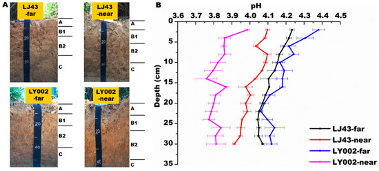 Figure 3. Soil profile and variation in pH of soil related to LJ43 and LY002 with different treatments. Data shows the mean ± standard deviation (n = 3). (A): soil profile for each treatment; (B): variation in pH in each treatment.