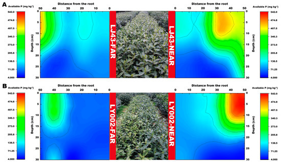 Figure 4. Variation in soil available P content related to LJ43 and LY002 with different treatments. (A): LJ43; (B): LY002. Data show the mean ± standard deviation (n = 3). The fertilization zone is located at the right-most side (i.e., 50 cm distance to LJ43-near or LY002-near main roots). Regarding the tea plants near the fertilization belts (LJ43-near or LY002-near), the fertilization belt was 50 cm distance from main roots of the tea plants; regarding the tea plants far from the fertilization belts (LJ43-far or LY002-far), the fertilization belt was 100 cm distance from the main roots of the tea plants.