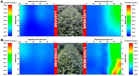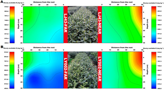 The distribution features of slowly available K in the soil profile for the two tea plants are presented in Figure 5. The slowly available K content of the two tea plants near the fertilization belt (LJ43-near or LY002-near) gradually decreased from the 50 cm distance from the fertilization belt to the roots. Moreover, the relative enrichment areas of slowly available K (>850 mg kg−1) were all concentrated within 40–50 cm of the main roots of the tea plants. The slowly available K in the LJ43-near soil, at 0–10 cm distance to the main roots, had a relatively larger variation in the horizontal direction than in the vertical section. The slowly available K in the LJ43-near soil had a larger variation in the tillage layer (0–20 cm) than in the lower layer, whereas the slowly available K in the LY002-near soil had a small variation in the entire vertical section, which was smaller than that of LJ43-near. The relative enrichment area of slowly available K in the LJ43-far soil, which was far away from the fertilization belt (>620 mg kg−1), was relatively expansive, whereas the slowly available K in the LY002-far soil was relatively narrower compared with that in the enrichment area. The slowly available K in most LJ43-far-area soils, at 0–30 cm distance to the main roots in the horizontal direction, was above 600 mg kg−1, whereas the slowly available K in most LY002-far area soils was above 600 mg kg−1. In addition, the relative enrichment areas of available K (>200 mg kg−1) were concentrated 30–50 and 35–50 cm away from the main roots of the tea plants for LJ43-near and LY002-near, respectively (Figure 6A), and their content gradually changed along the distance from the fertilization belt for LJ43-near. The largest enrichment area of available K was 15–30 cm away from the ground (Figure 6B). The relative enrichment areas of available K were 45–50 cm away from the main roots for LJ43-far, and the content of available K was above 175 mg kg−1, whereas the available K was above 150 mg kg−1 for LY002-far.