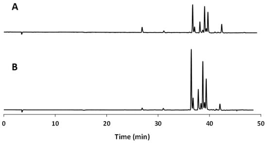 HPLC-UV chromatographic profile of the best performing AP samples: OD with PS 250–400 μm (A); HFD with PS > 400 μm (B).