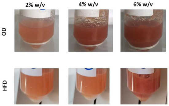 Differences can be detected between the samples obtained from OD and HFD. Comparing hydrogels obtained using the same AP percentages, the sample OD showed a higher thickening capacity than HFD. This can be easily explained comparing the shear stress value measured for each sample at a fixed shear rate. As an example, in Table 6 the shear stress values at the shear rate value of 3.55 × 10−1 1/s are reported.