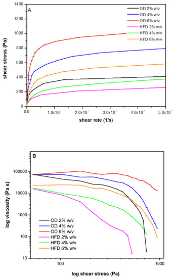 (A) Plot of Shear stress (Pa) as a function of shear rate (s−1) and (B) plot of log viscosity (Pa·s) as a function of log shear stress (Pa). registered at 25 °C of hydrogels obtained from OD and HFD samples using three different percentages (2, 4 and 6% w/v), n = 3, the bars represent the SD.