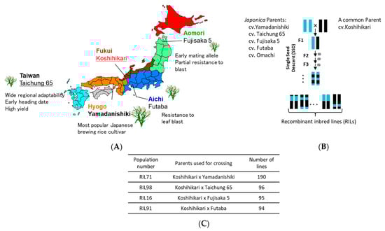 (A) Origin of Japanese rice parents used for generating Japanese recombinant inbred lines (RILs). (B) A simplified crossing scheme using single seed descend method (SSD) to generate the four RIL populations used in this study and number of their corresponding progeny lines (C).