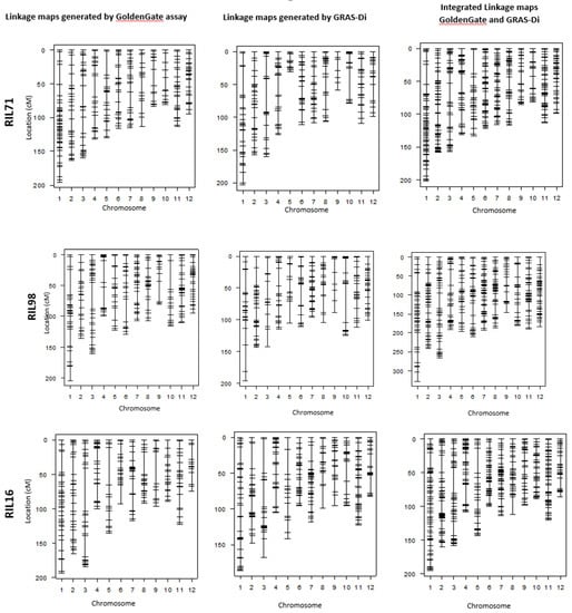 In an attempt to confirm the increase of DNA marker information provided by GRAS-Di technology, we compared the linkage maps generated by GoldenGate assay with the integrated linkage maps generated by both GRAS-Di and GoldenGate assay (Figure 3 and Figure 4). The linkage map generated by GoldenGate assay provided a total of 292 markers in RIL71, 277 markers in RIL98, 262 markers in RIL16, and 286 markers in RIL91 (Table 4). The number of markers increased to 527 in RIL71 when we integrated makers generated by GRAS-Di and GoldenGate technologies together. Likewise, the integrated linkage maps from GRAS-Di and GoldenGate displayed a total of 455 markers in RIL98, 501 markers in RIL16, and 436 markers in RIL91 (Table 2).