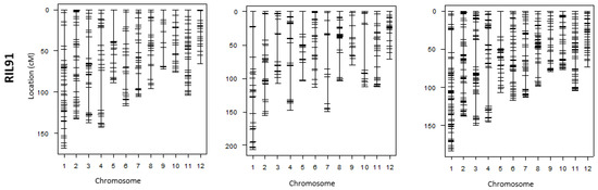 The density of DNA markers, their distribution, and information on the integration linkage map for the four populations are summarized in Table 2. For RIL71, the total genome length is 1515 cM, including the above-mentioned 527 markers with unique map positions. The average distance between adjacent markers is 2.9 cM. Chromosome 7 is the most saturated, with an average distance of 2.3 cM. However, chromosome 5 is the least saturated, with an average distance of 4.7 cM. The longest chromosome is chromosome 1, with a total length of 202 cM, and the shortest is chromosome 10, with an average length of 81.7 cM. After excluding the co-localized markers, the integrated linkage map derived from genotyping of RIL98 population exhibits a total genome length of 1489 cM; the average distance between adjacent markers is 3.4 cM. Chromosome 1 is the longest, with an average length of 200.4 cM, and chromosome 9 the shortest one, with an average length of 90.4 cM. The most saturated chromosome is chromosome 7, with an average distance of 2.1 cM, whereas chromosome 10 is the less saturated, with an average distance 4.5 cM between markers. As for the integration map using RIL16 population, the full genome length is 1485.2 cM, and the average distance between adjacent markers is 3 cM. Chromosome 1 is the longest chromosome, with an average length of 195.7 cM, and chromosome 12 is the shortest one, with an average length of 86.3 cM. The most saturated chromosome is chromosome 6, with an average distance of 2.1 cM, and chromosome 3 is the least saturated, with an average distance 3.5 cM between markers. Integrated linkage map of RIL91 shows a full genome length of 1389.9 cM, with an average distance between adjacent markers of 3.4 cM. Chromosome 1 is the longest chromosome, with an average length of 183.6 cM, and chromosome 12 the shortest one, with an average length of 73.7 cM. The two densest chromosomes are chromosomes 11 and 12, with an average distances of 2.6 cM, whereas chromosome 4 contains the fewest markers, with an average distance of 4.7 between markers.