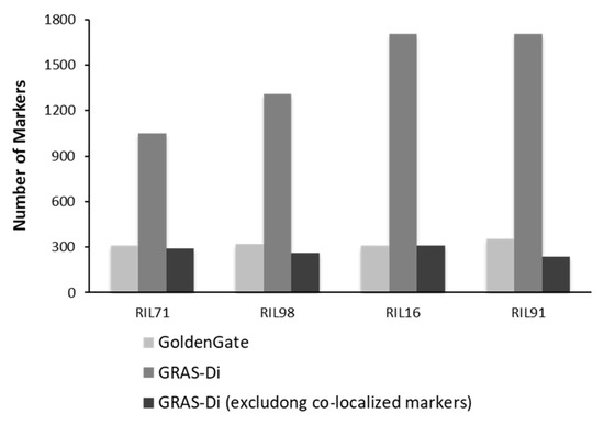 After the integration of all markers together, only one reliable marker was kept among a set of co-localized markers. Once the remaining co-localized markers were removed, we retained 527, 455, 501, and 436 markers for RIL71, RIL98, RIL16, and RIL91, respectively (Figure 2, Table 2). This suggested the location, on average, of one DNA marker every 700 kb, 820 kb, 744 kb, and 850 kb in RIL71, RIL98, RIL16, and RIL91, respectively (based on a genome size of Nipponbare reference sequence of approximately 373 Mb (IRGSP-1.0)). The integration map of all markers generated by both GoldenGate assay and GRAS-Di technology displayed a total of 1360, 1605, 2018, and 2056 markers for RIL71, RIL98, RIL16, and RIL91, respectively (Table 3).