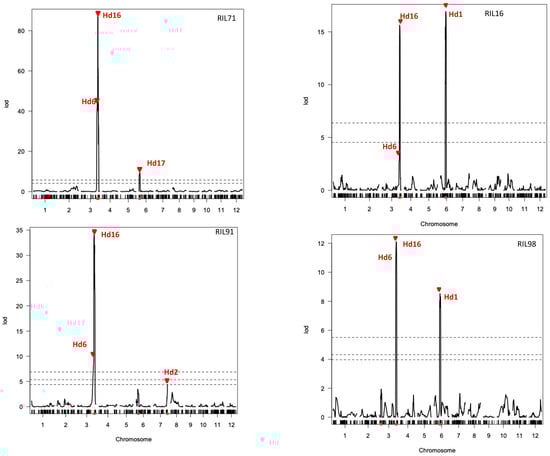 Heading date (Hd) is an important trait for adaptation and expansion of rice to different cultivation areas. QTLs analysis for Hd was performed using the above linkage maps. As shown in Figure 5, significant LOD scores over the thresholds indicated the presence of QTLs in three chromosomes: chromosomes 3, 6, and 7. Peaks of LOD scores in these chromosomal regions were confirmed to be involved in heading date trait using the linkage map data of four RIL populations (Figure 5). The QTLs for Hd6 and Hd16 were detected on chromosome 3 using the four integrated linkage maps generated in this study. Additionally, three more QTLs were detected in chromosome 6 (Hd1, using linkage maps of RIL16 and RIL98; and Hd17, using linkage map of RIL71) and chromosome 7 (Hd2, using linkage map of RIL91).