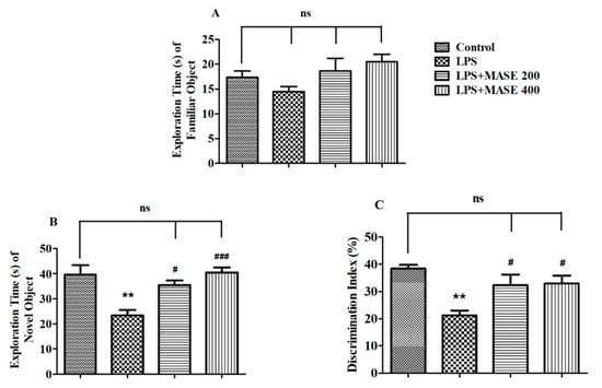 Effect of methanolic Ajwa seed extract (MASE) on (A) exploration time of a familiar object (FO) during the test session, (B) exploration time of a novel (NO) object during the test session, (C) discrimination index between two objects of LPS-induced rats using novel object recognition test. The results are expressed by mean ± SEM (n = 6). One-way ANOVA [F(3,20) = 2.254, p > 0.05 for exploration time of FO, F(3,20) = 9.603, p < 0.001 for exploration time of NO and F(3,20) = 7.097, p < 0.01 for discrimination index] followed by the Tukey–Kramer multiple comparisons test for comparisons within the groups. ** p < 0.01 as compared to the control group; ns—not significant as compared to the control group; # p < 0.05 and ### p < 0.001 as compared to the LPS-induced group.