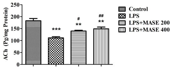 Effect of methanolic Ajwa seed extract (MASE) on brain acetylcholine (ACh) levels of LPS-induced rats. The results are expressed by mean ± SEM (n = 6). One-way ANOVA [F(3,20) = 19.59, p < 0.001] followed by the Tukey–Kramer multiple comparisons test for comparisons within the groups. ** p < 0.01 and *** p < 0.001 as compared to the control group; # p < 0.05 and ## p < 0.01 as compared to LPS-induced group.