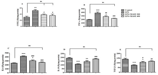 Effect of methanolic Ajwa seed extract (MASE) on (A) COX-2, (B) TNF-α, (C) IL-6, (D) IL-10, and (E) TGF-β1 of LPS-induced rats. The results are expressed by mean ± SEM (n = 6). One-way ANOVA [F(3,20) = 7.414, p < 0.01 for COX-2; F(3,20) = 19.77, p < 0.001 for TNF-α; F(3,20) = 36.40, p < 0.001 for IL-6; F(3,20) = 15.25, p < 0.001 for IL-10; and F(3,20) = 11.85, p < 0.001 for TGF-β1] followed by the Tukey–Kramer multiple comparisons test for comparisons within the groups. * p < 0.05, ** p < 0.01, and *** p < 0.001 as compared to the control group; ns—not significant as compared to the control group; # p < 0.05, ## p < 0.01, and ### p < 0.001 as compared to the LPS-induced group.