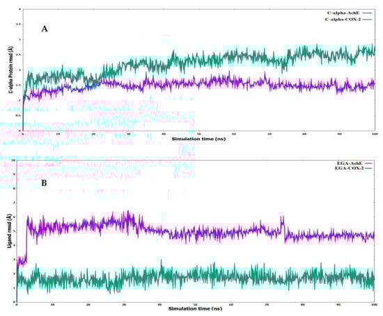 Root mean square deviations (RMSD) for the (A) α-carbon chain of AChE and COX-2 (B) ligand (EGA—ellagic acid) complexed with AChE and COX-2.