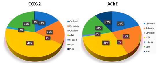Contribution of basic interactions to binding free energies of bound ellagic acid in COX-2 and AChE.