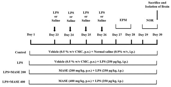 The total number of twenty-four male rats was divided into four groups, so each group consisted of six rats. In the control group (I), rats were treated orally with the vehicle (0.5% w/v CMC) for 30 days and were given four injections of normal saline (0.9% w/v, i.p.) from day 23 to day 26. In the LPS-induced group (II), the rats were treated orally with the vehicle (0.5% w/v CMC) for 30 days and were given four injections of LPS (250 µg/kg, i.p.) from day 23 to day 26. In the test groups (III and IV), the rats were treated orally with MASE 200 mg/kg or 400 mg/kg, respectively, for 30 days, and were given four injections of LPS (250 µg/kg, i.p.) from day 23 to day 26. The doses of MASE (200 and 400 mg/kg, p.o.) were chosen based on the findings of our acute toxicity experiments and in parallel with our prior work with aqueous Ajwa seed extract []. The dose of LPS (250 µg/kg, i.p) was also determined from a research report from our laboratory []. For the spatial memory assessments of rats, an elevated plus-maze test was performed on days 27 and 28, and a novel object recognition (NOR) test was performed on days 29 and 30 of the drug treatment schedule. At the end of the drug treatment and tests (day 30), all the animals were sacrificed for the preparation of the brain homogenate (Figure 9).