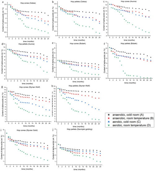 The content of alpha-acids in hops is the most important beer brewing parameter for two reasons. First, the price of the hops is based on the alpha-acid content and second, the doses of hop in beer recipes are based on the weight (mg) of alpha-acids per litre and not on the weight (mg) of hops added per litre. A huge amount of alpha-acids can be lost during storage under improper conditions. Figure 1a–j shows the changes in alpha-acid content for the different hop varieties and shapes (cones or pellets). The conditions are indicated by the following letters: A-anaerobic, cold room; B-anaerobic, room temperature; C-aerobic, cold room; and D-aerobic, room temperature. The differences between different storage conditions were evaluated by performing one-way ANOVA at the 0.05 significance level for each variety and each form of hops. The Tukey’s means comparison test was subsequently performed to evaluate which groups showed differences and at which time points.