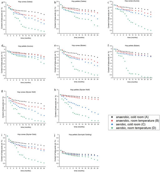 As observed for the alpha-acids, the beta-acid content is also the sum of co- and (n+ad)-humulone. The results of beta-acids storage trials are shown in Figure 2a–j. Figure 2a shows differences for Celeia cones, Figure 2b for Celeia pellets, Figure 2c for Aurora cones, Figure 2d for Aurora pellets, Figure 2e for Bobek cones, Figure 2f for Bobek pellets, Figure 2g for Styrian Wolf cones, Figure 2h for Styrian Wolf pellets, Figure 2i for Styrian Gold cones and Figure 2j for Savinjski golding pellets. Unlike the case for the alpha-acids, the form of the hop was a significant factor in the stability of beta-acids. Taking into account all varieties, all conditions and both shapes, higher amounts of beta-acids were retained in hop pellets than in hop cones (p < 0.001). This is because pelletising reduces the surface area of the hop samples, so they oxidise more slowly than hop cones. The only exception was the Bobek variety (Figure 2e,f), where complete degradation of both alpha- and beta-acids occurred in hop pellets under condition D. Anaerobic conditions in a cold room were favourable for retention of the greatest amounts of beta-acids in all hop varieties and sample shapes. Under condition A, the Aurora variety showed the greatest stability among the hop cones (Figure 2d), and the Styrian Wolf variety showed the best stability among the pellets (Figure 2h). The beta-acid losses ranged from 25–35% for hop cones and 11–33% for pellets after two years of storage. Comparison of conditions B and C revealed that the losses after two years were 10–50% higher for hops stored under condition C. However, Styrian Gold cones, Bobek pellets and Savinjski Golding pellets did not show significant differences when stored in the B and C conditions. Nevertheless, the atmospheric conditions had a higher impact on the loss of beta-acids than the temperature did (p < 0.01), thereby confirming the findings of Krofta et al. [20]. Under condition D, all varieties stored as hop cones lost more than 88% of their beta-acids. In pellets, the loss was more variety-dependent, as losses of beta-acids were 45% for Aurora, 60% for Savinjski Golding, 74% for Celeia, 93% for Styrian Wolf and 98% for Bobek. Interestingly, the Styrian Wolf pellets were the most stable under condition A but almost the least stable under conditions C and D. This is one more indicator that storage conditions do play an important role in hop stability.