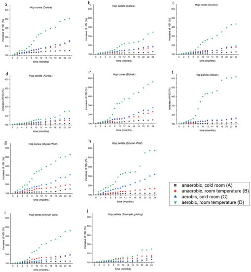 The HSI serves as a quality indicator, since it reflects the ratio between the levels of the oxidation products of acids and the acids themselves. It cannot be used to determine the exact age of a hop sample, but it can serve as a quick determinator of the proper handling and storage of hops. Figure 3a–j shows the percentage increase in the HSI values for all six varieties. Figure 3a shows differences between various conditions for Celeia cones, Figure 3b for Celeia pellets, Figure 3c for Aurora cones, Figure 3d for Aurora pellets, Figure 3e for Bobek cones, Figure 3f for Bobek pellets, Figure 3g for Styrian Wolf cones, Figure 3h for Styrian Wolf pellets, Figure 3i for Styrian Gold cones and Figure 3j for Savinjski golding pellets. Three-way ANOVA of all results (i.e., the full two-year trial) was performed to detect any statistical differences between conditions, varieties and forms. The population means of the interaction of all three factors were significantly different (p < 0.02), indicating that all three factors had an impact on the HSI value. A closer look (Tukey test) into the conditions revealed no statistical differences between conditions B and C after two years when all varieties were considered. Overall, the storage performance was better for hop pellets than for hop cones, especially under condition D. Under condition A, the smallest increase (13%) in the HSI was noted for Bobek pellets, which is interesting since the content of alpha- and beta-acids in Bobek was not very stable. Conversely, the Bobek pellets had the worst HSI under condition D for both cones and pellets. Under condition D, the hop cone HSI value was 400% of the starting value or higher. The cones of Celeia showed the highest increase in HSI (53%) under condition A. Conditions B and C had almost the same impact on HSI (50–100% increase), except for Styrian Wolf, where condition B was better than condition C. The most noticeable changes between conditions A and B/C were observed after 4–8 months (depending on the variety). After one year of storage under condition A, the HSI of the pellets increased by 8–15%, in agreement with the findings of Mikyška and Krofta [13], who found an increase of 5–16% under the same conditions. A similar effect was noted for condition B, where the percentage loss fluctuated at around 35% after one year. However, the increase in HSI under condition D was comparable in the Czech varieties and in the Bobek and Styrian Wolf pellets, but higher than in the Celeia, Aurora and Savinjski Golding pellets. Our results are also comparable with those reported by Tembo [15], who showed losses of about 5–15% after half a year under condition A. Rutnik et al., who investigated the impact of hop freshness on dry-hopped beer, determined that Aurora and Celeia produce a lower quality beer if hops with HSI values lower than 0.4 are used and that this limit is 0.5 for Styrian Wolf hops. If starting with hops with HSI values of 0.3, which is considered the upper limit for fresh and well-handled hops, all five varieties of pellets would not exceed an HSI value of 0.4 in two years if stored under condition A. The cone value would be somewhere around 0.4–0.45. Under condition D, those values would be reached in 2–8 months, depending on the variety and form.