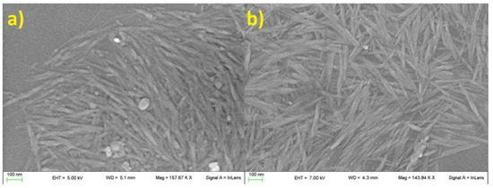 CNC-CH (a), CNC-EN (b), observed through SEM. No particular differences in size and shape were observed, other than the presence of a larger mass of impurities in CNC-CH samples.