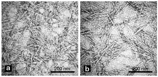 TEM analysis of CNC from tomato waste obtained by chemical (a), and enzymatic (b) extraction protocols. Images were recorded at 100 kX. Samples were stained with 2% uranyl acetate in distilled water prior to observation.