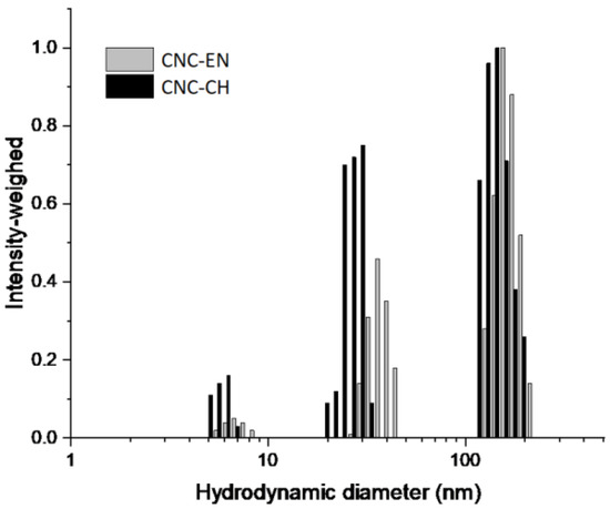 Particle size analysis confirmed the morphological observations. Both conditions produced CNC populations with a Nicomp mean hydrodynamic diameters (NMHD) of around 150 nm and smaller populations of around 30–40 nm and 7 nm (Figure 3). These populations are potentially ascribable to impurities arising from process residues. Consistently with SEM analysis, these smaller populations produced a higher scattering intensity in the chemically extracted samples (Figure 3) in line with the postulated higher contamination of the CNC-CH compared with CNC-EN.