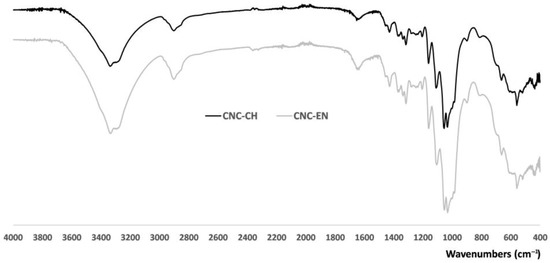 ATR-IR spectra of CNC-CH and CNC-EN. Unprocessed powder samples were analyzed directly at r.t. in the 400–4000 cm−1 region, acquiring100 scans with a resolution of 4 cm−1.