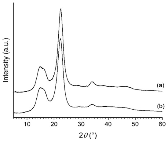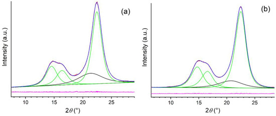 X-ray powder diffraction (XRD) patterns were collected with a D8 Advance diffractometer (Bruker AXS GmbH, Karlsruhe, Germany) in Bragg–Brentano geometry, equipped with a Lynxeye XE-T position sensitive detector, using the Cu-Kα radiation (40 kV, 40 mA). Data were collected in the 4–60° 2θ range using a 0.030° step scan and 1 s counting time. The patterns were decomposed in the contributions of cellulose Iβ reflections, and the amorphous content by means of a profile fit procedure with pseudo-Voigt functions, in the 7–29° 2θ range, using the Philips ProFit software, following the method described by C. J. Garvey et al. (2005) [49,50]. The crystallinity index was estimated as the wt% of the crystalline phase, assuming that the area under the diffraction peaks was proportional to the weight amount of each phase.